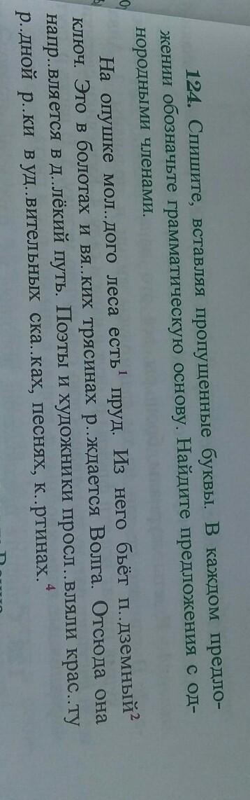 На опушке молодого леса есть пруд (есть пруд). Из него бьёт подземный ключ (бьёт ключ). Это в болотах и вязких трясинах рождается Волга (рождается Волга). Отсюда она направляется в далёкий путь (она направлется). Поэты и художники прославляли красоту родной реки в удивительных сказках, песнях, картинах (поэты и художники прославляли).