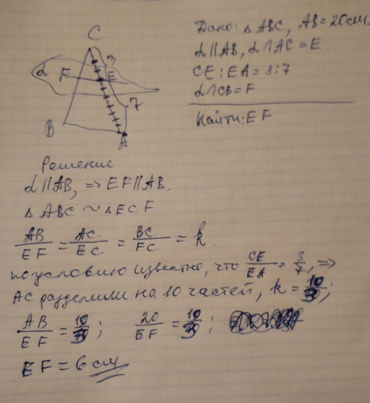 Дан треугольник ABC.Плоскость параллельна прямой АB,пересекает сторону АС в точке Е, а сторону BC в точке F.Точка Е делит отрезок АС в отношении 3:7,считая от точки С.