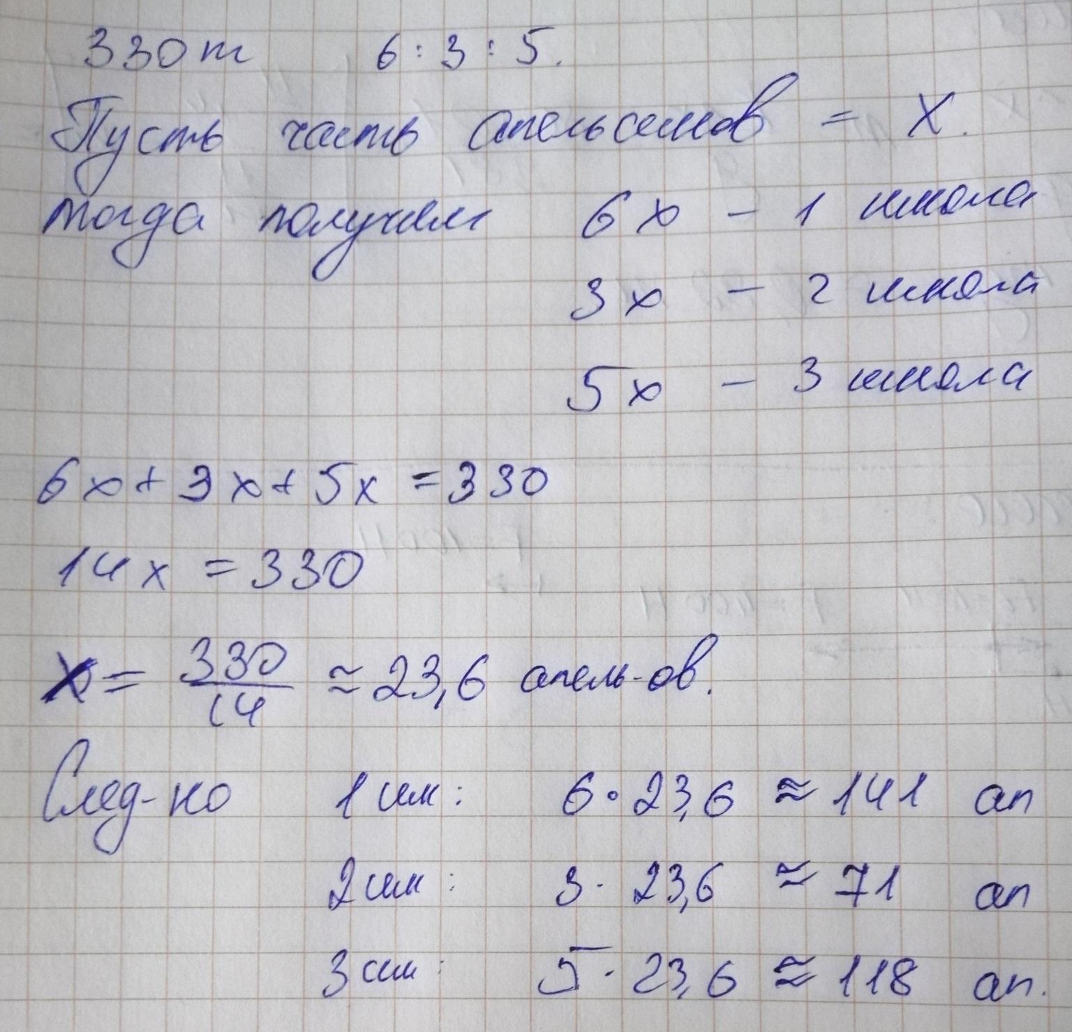 между 3 школа распределили 330 кг апельсинов в отношении 6:3:5 . сколько кг получила каждая школа?