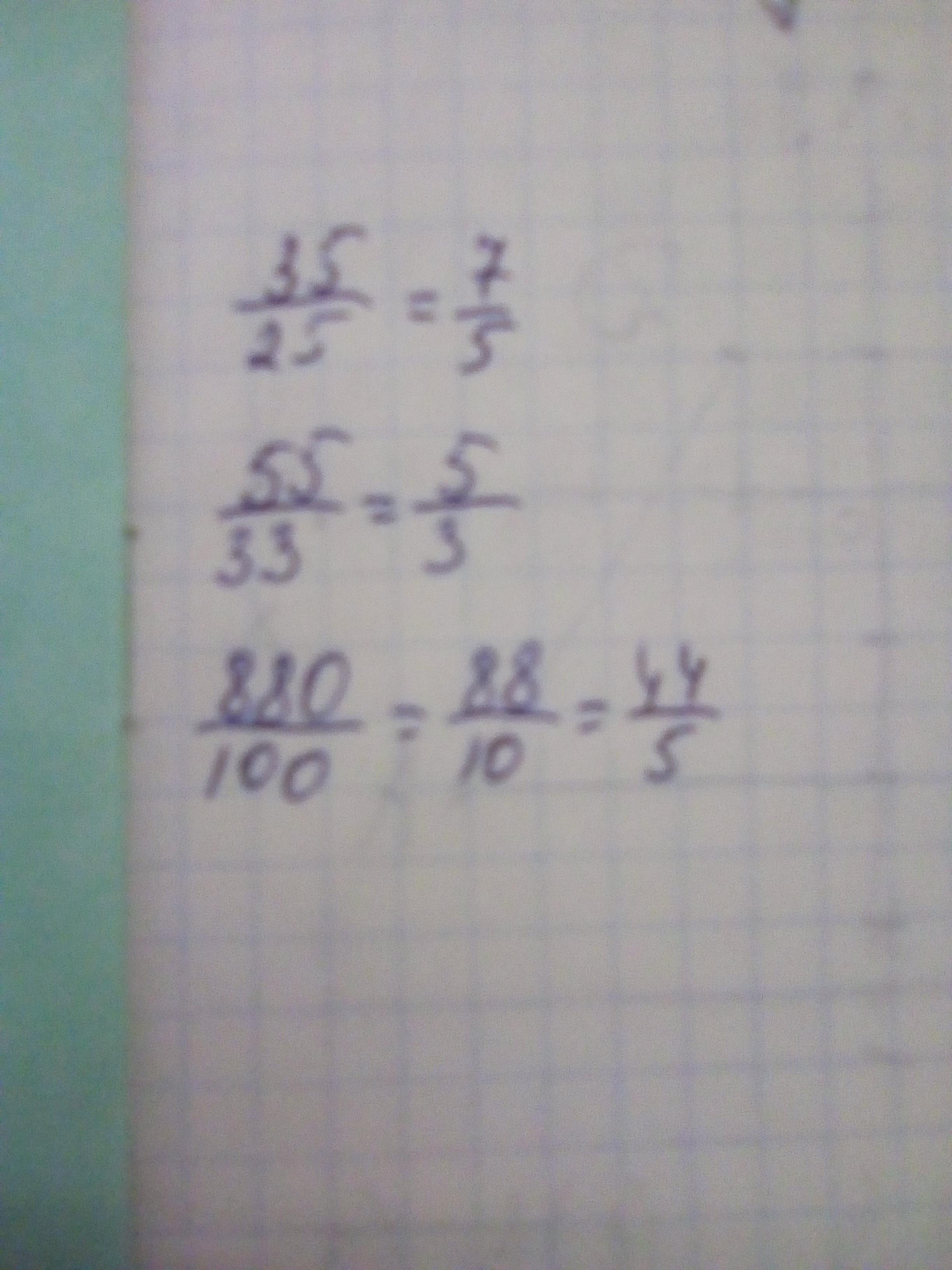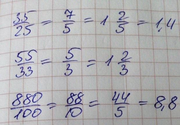 Сократить неправильную дробь и затем выделить из неё целую часть 35/25 55/33, 880/100. Пожалуйста. Очень надо