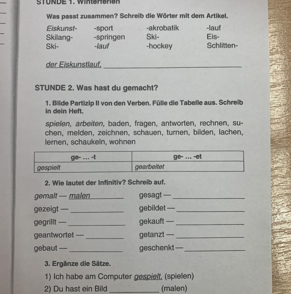 zeigen, grillen, antworten, bauen, sagen, bilden, kaufen, tanzen, schenken