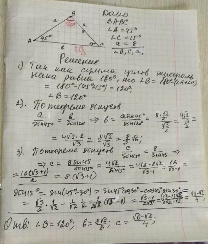 В треугольнике АБС угол А=45, угол С=15, сторона а=8. Найдите неизвестные элементы треугольника