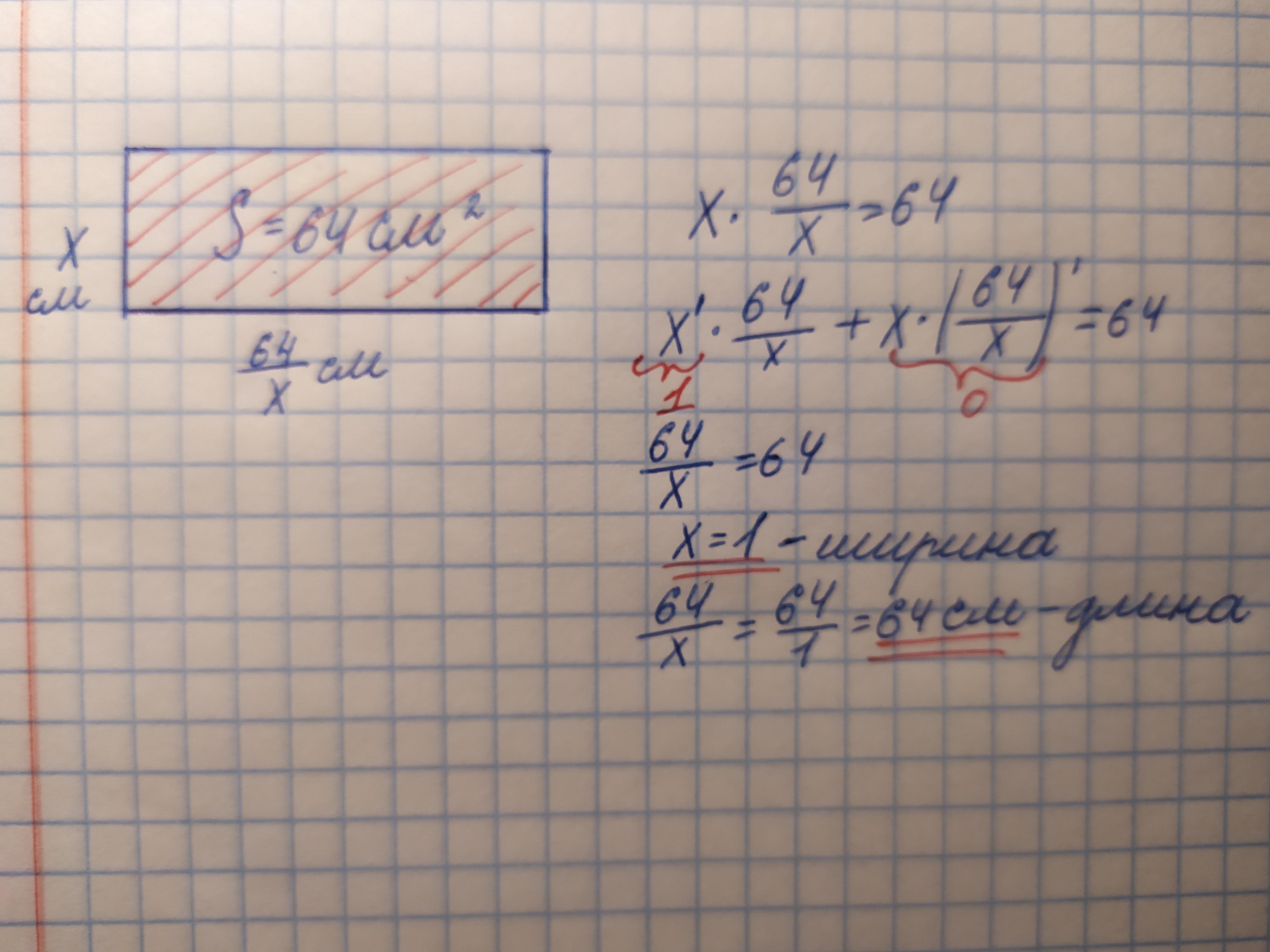 сколько см в длину имеет стороны прямоугольника , если возможное наибольшое значение площади 64 см ?