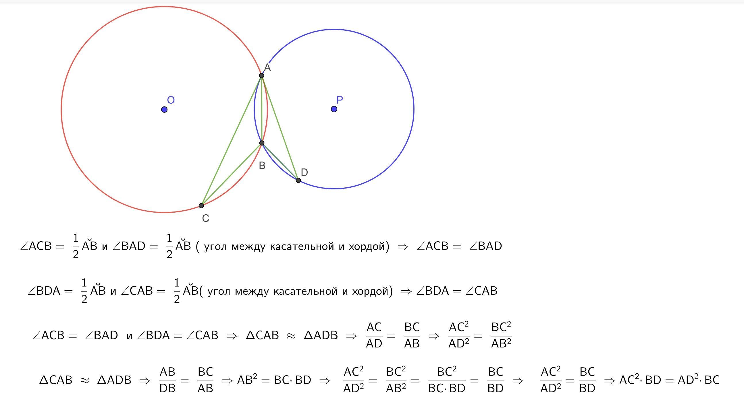 Две окружности пересекаются в точках А и В. Через точку А проведены отрезки АС и АD, каждый из которых, являясь хордой одной окружности, касается другой. Доказать, что AC^2 *BD=AD^2 *BC.