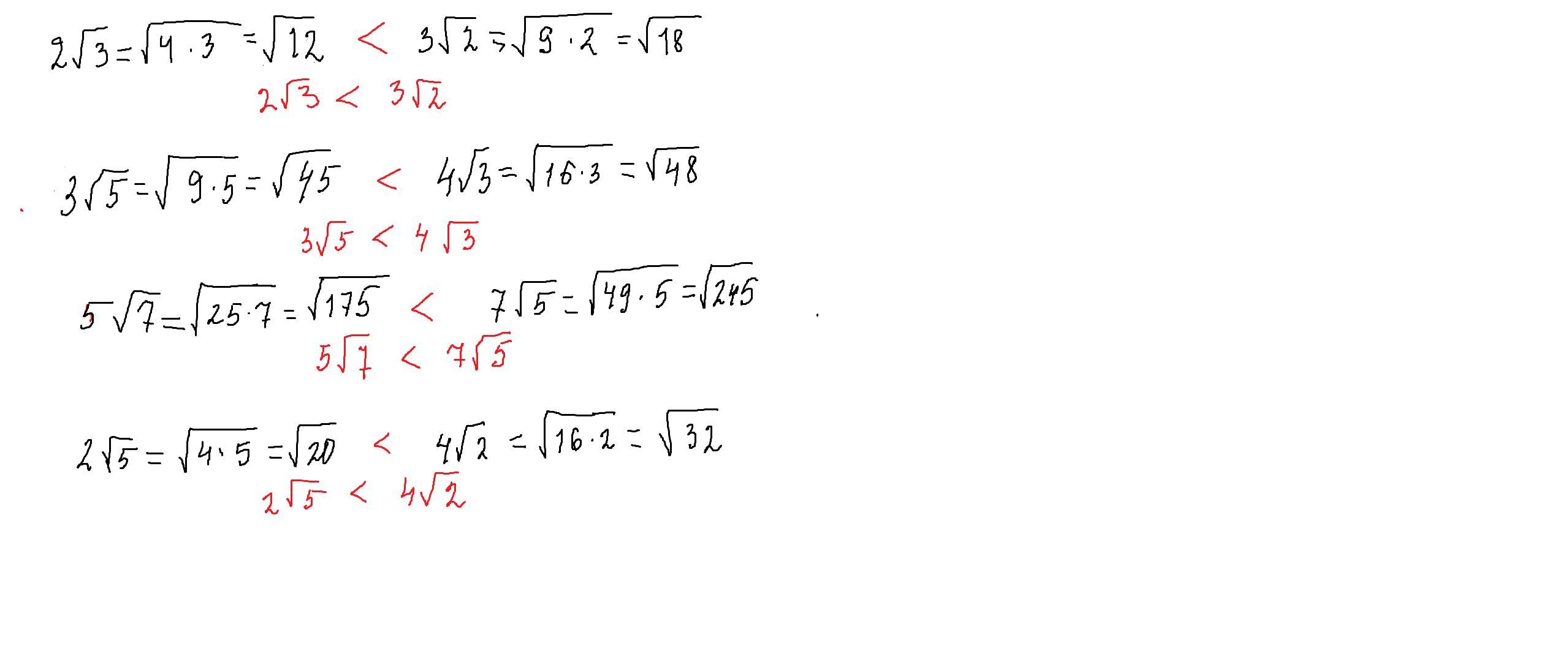 Не извлекая квадратного корня,определите,которое из чисел больше: а) 2корень3 или 3корень2; б) 3корень5 или 4корень3; в) 5корень7 или 7корень5; г) 2корень5 или 4корень2