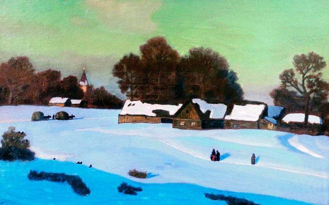 На переднем плане изображено время года - зима. Очень красочно изображен снег. По дороге идут тепло одетые люди. Позади находятся деревянные дома, крыши которых были засыпаны снегом. За строениями простирается лес, где можно разглядеть церквушку.