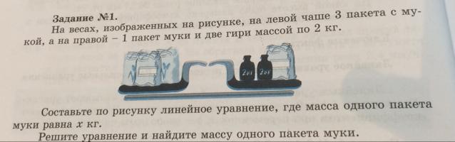 на левой чаше весов 3 пакета муки массой 3*х кг