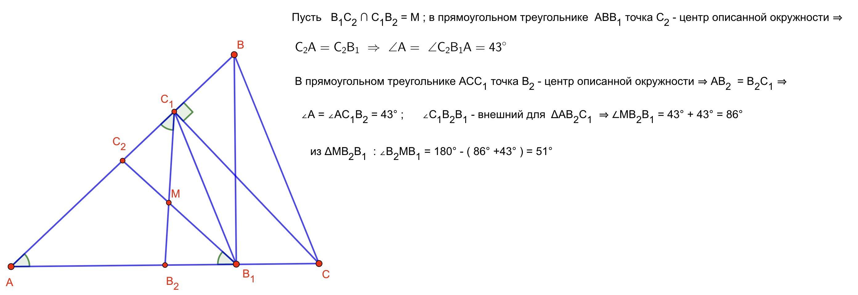Угол A остроугольного треугольника ABC равен 43∘. BB1 и CC1 — высоты треугольника, B2 и C2 — середины сторон AC и AB соответственно. Найдите величину острого угла между прямыми B1C2 и C1B2