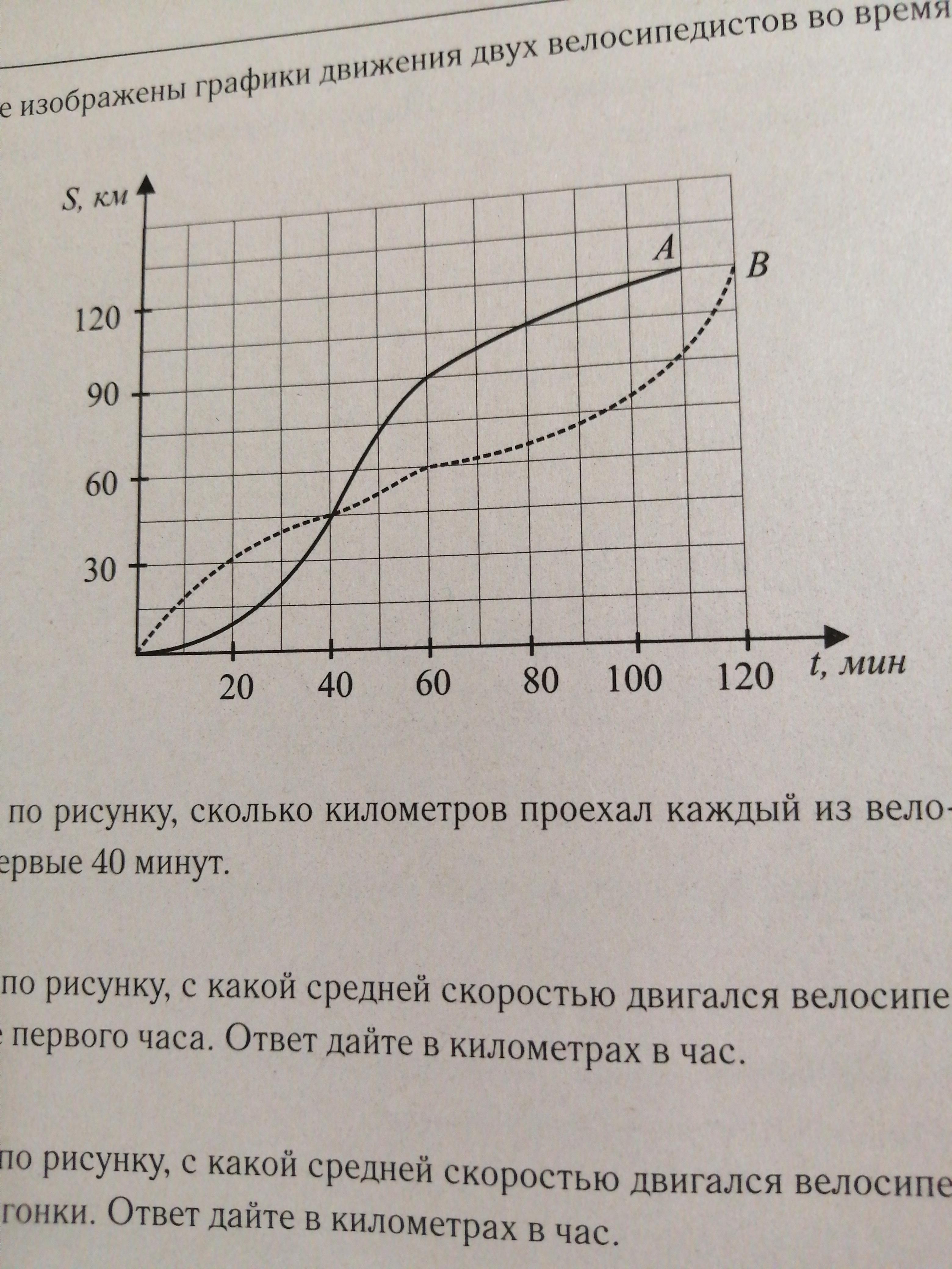 определите по рисунку, с какой средней скоростью двигался велосепедист А в течение первого часа. Ответ дайте в километрах в час
