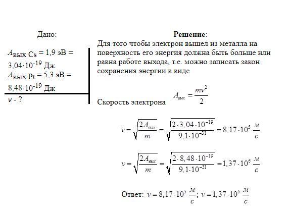 Какой наименьшей скоростью должны обладать свободные электроны в цезии и платине для того, чтобы они смогли покинуть металл?