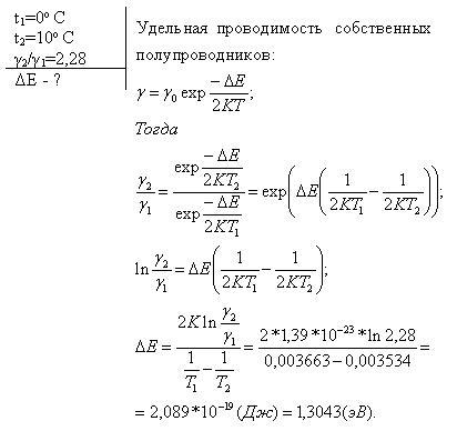 При нагревании кремниевого кристалла от температуры 0°С до температуры 10°С его удельная проводимость возрастает в 2,28 раза. По приведенным данным определить ширину dE запрещенной зоны кристалла кремния.