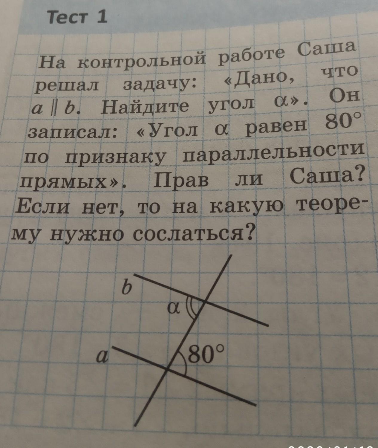 Признак позволяет установить параллельность прямых, в этой задаче уже известно, что прямые параллельны. Не прав. А ссылаться надо на теорему, обратную признаку параллельности прямых.