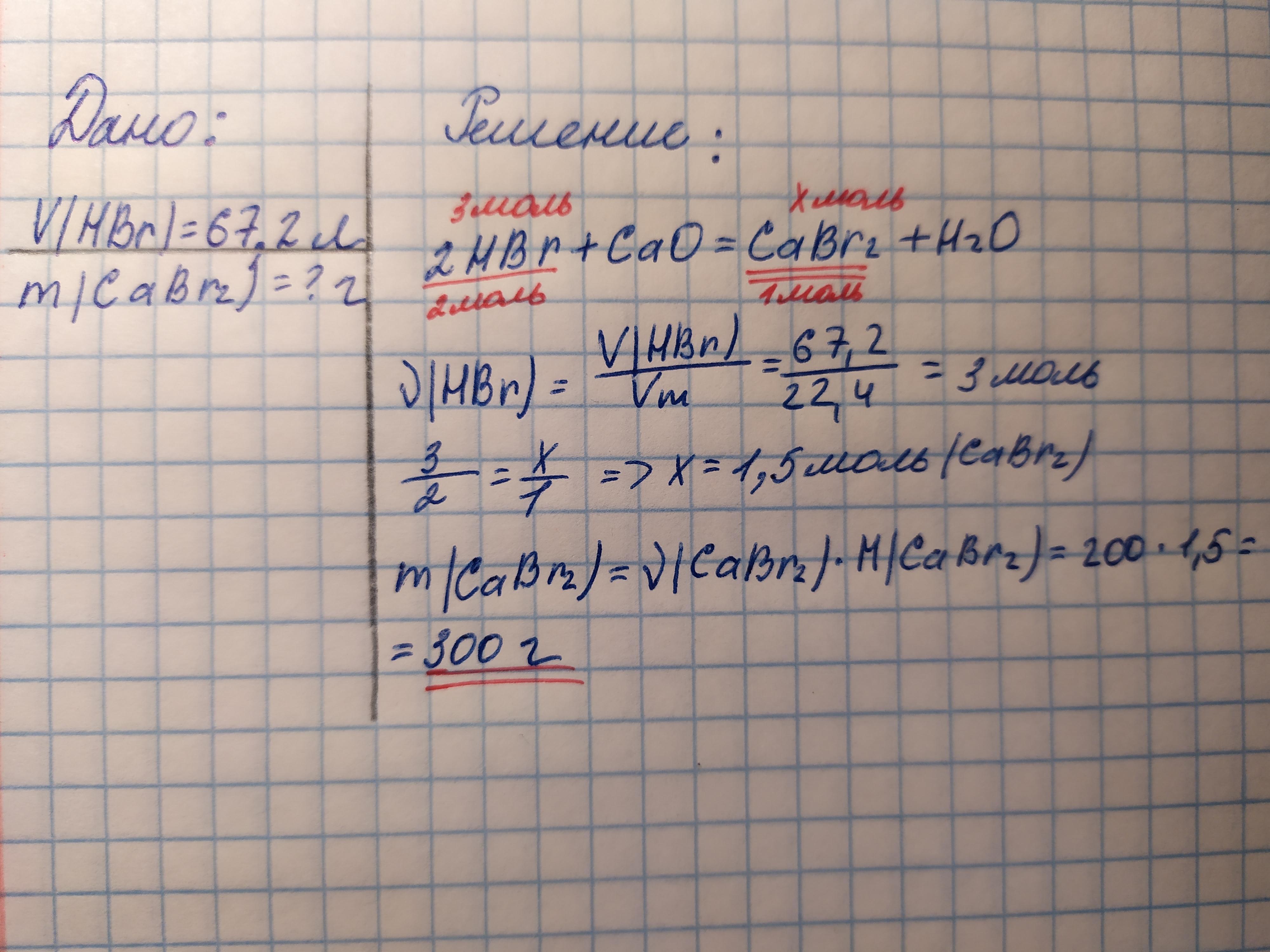 Сколько г бромида калия образуется в реакции оксида кальция с 67,2л бромоводородной кислоты?