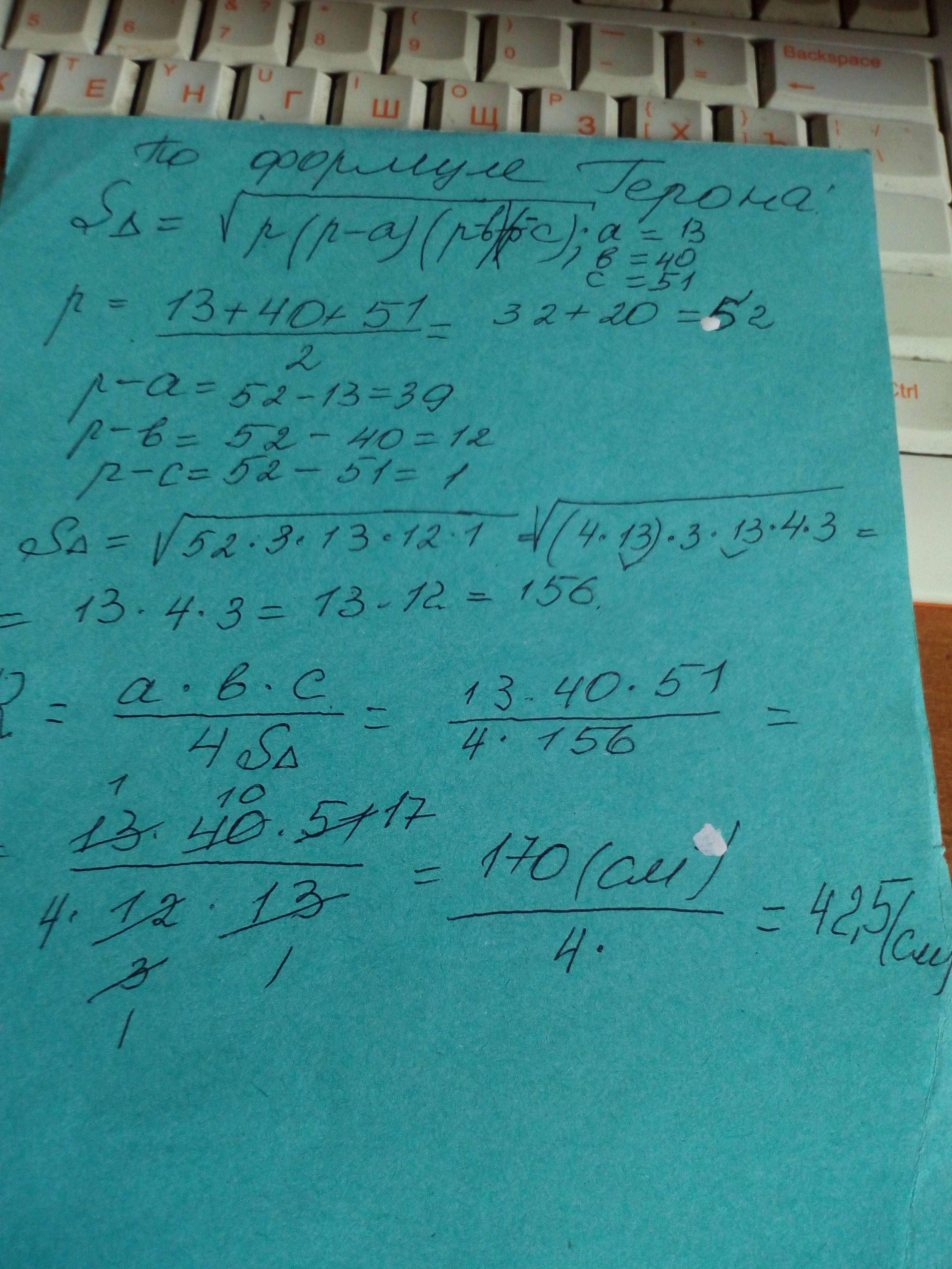 Площадь треугольника с одной стороны ищем по формуле Герона, и делим площадь на произведение 4*а*b*с, где а=13, b=40,с=51