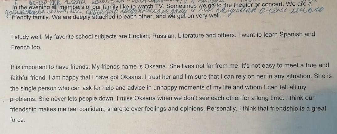 Очень важно иметь друзей. Моих друзей зовут Оксана. Она живет недалеко от меня. Нелегко встретить правду, и я могу положиться на нее в любой ситуации. Она верный друг. Я счастлив, что у меня есть Оксана. Я доверяю ей, и я уверен, что единственный человек, который может обратиться за помощью и советом в несчастливые моменты моей жизни, и кто может рассказать обо всех моих проблемах. Она никогда не подводит людей. Я скучаю по Оксане, когда мы долго не видимся. Я думаю, что наша дружба заставляет меня чувствовать себя уверенно: делиться чувствами и мнениями. Лично я считаю, что дружба - это великая сила