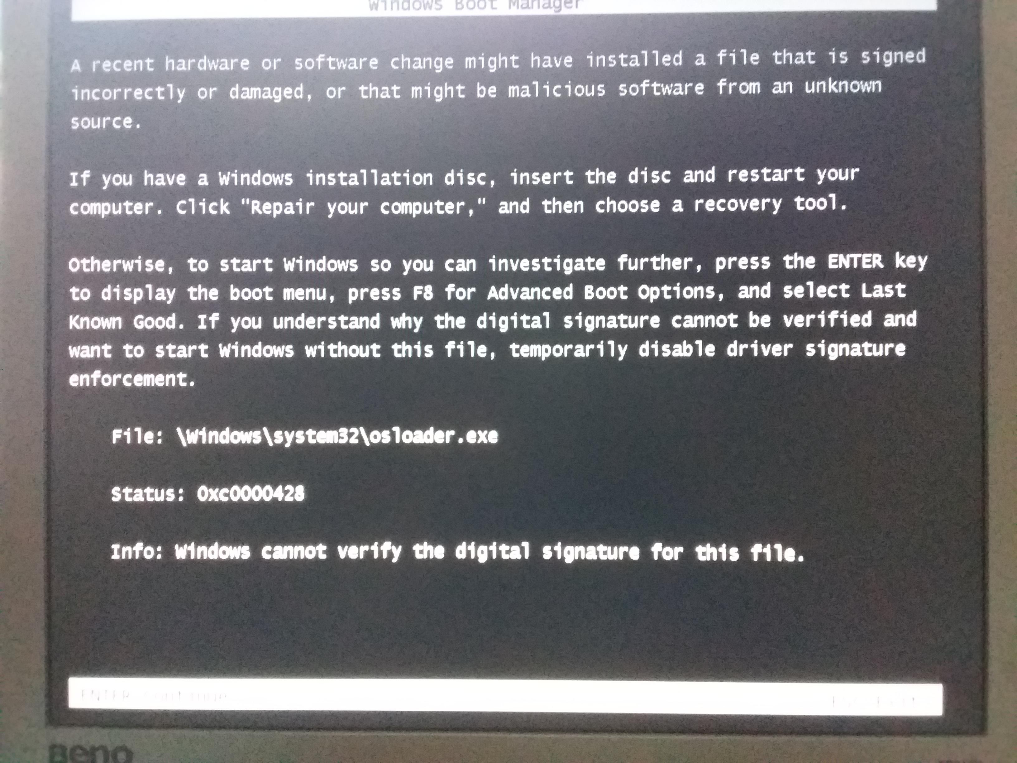 Там ясно написано, нельзя проверить электронную подпись файла, в связи с чем нельзя его загрузить. Файл тоже написан - загрузчик операционной системы. Два варианта - либо это программный сбой, и если перезагрузка его не исправит - то нечего делать, действительно - в сервисный. Либо это жёсткий диск повредился, и тут уже точно делать нечего