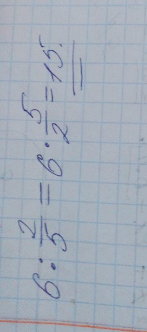 Нужно 6 разделить на 2/5 , деление заменить умножением , а для дроби найти ей обратную это будет 5/2. 6 умножить на 5/2 . 6 и 2 сократить, остается 3 умножить на 5 =15. Ответ 15