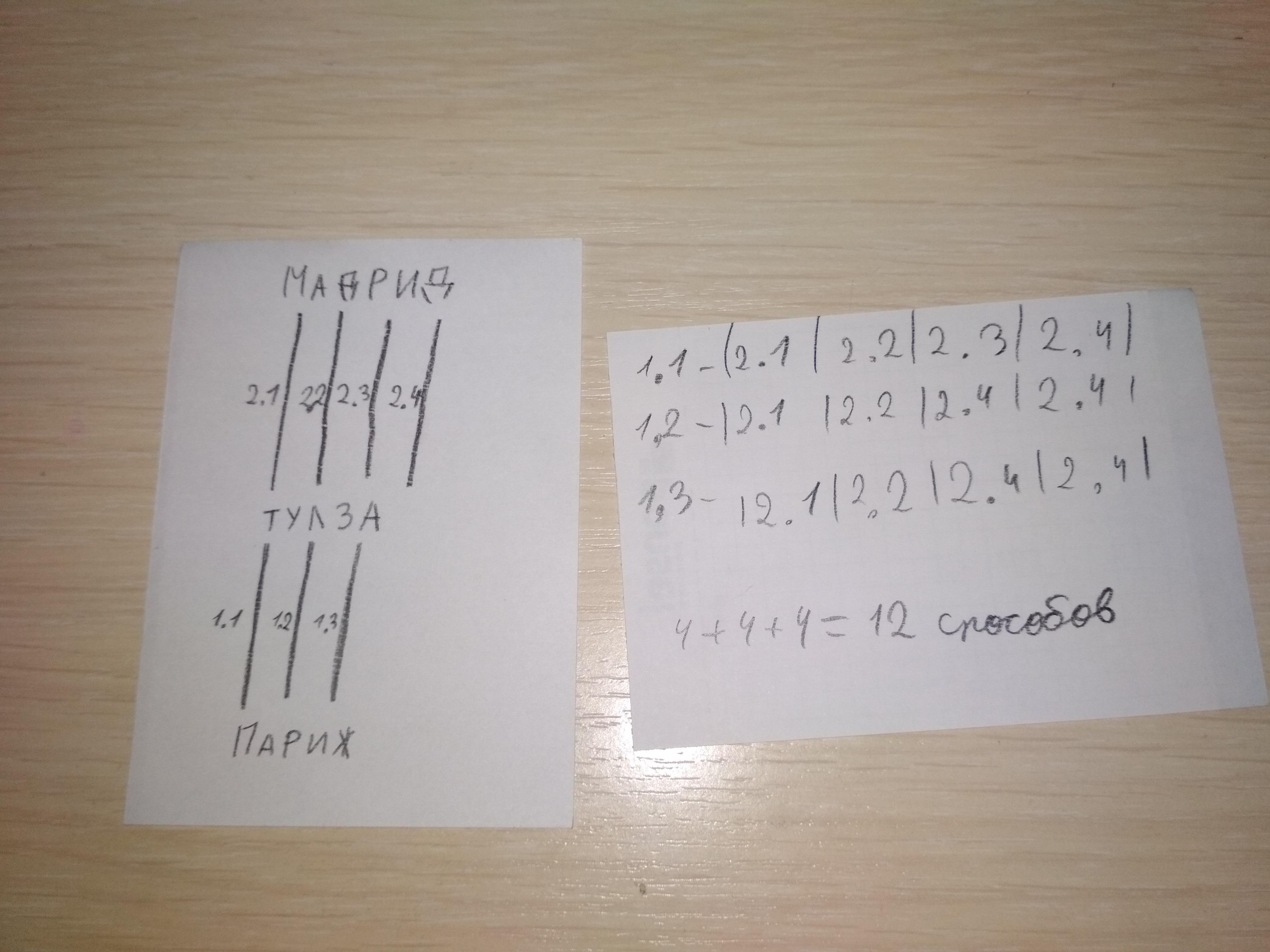 Предположим, что имеются 3 автомобильные дороги, идущие от Парижа до Тулузы, и 4 — от Тулузы до Мадрида. Сколькими способами можно выбрать дорогу от Парижа в Мадрид через Тулузу? Попытайтесь найти систематический метод для последовательного нахождения решения так, чтобы можно было составить список способов, не пропустив ни одного из них.