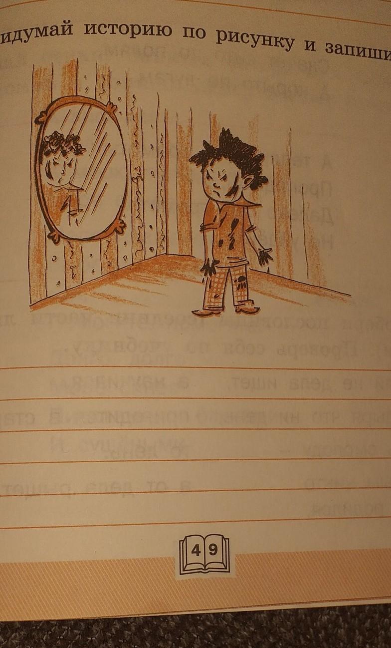 Маленький грязный мальчик Витя упал в лужу и испачкался в грязи. Он был очень зол и обижен. Вернувшись домой, не сняв свои ботиночки, он отправился к зеркалу, чтобы посмотреть, насколько сильно он замарался. В следующий раз он будет лучше смотреть на дорогу.