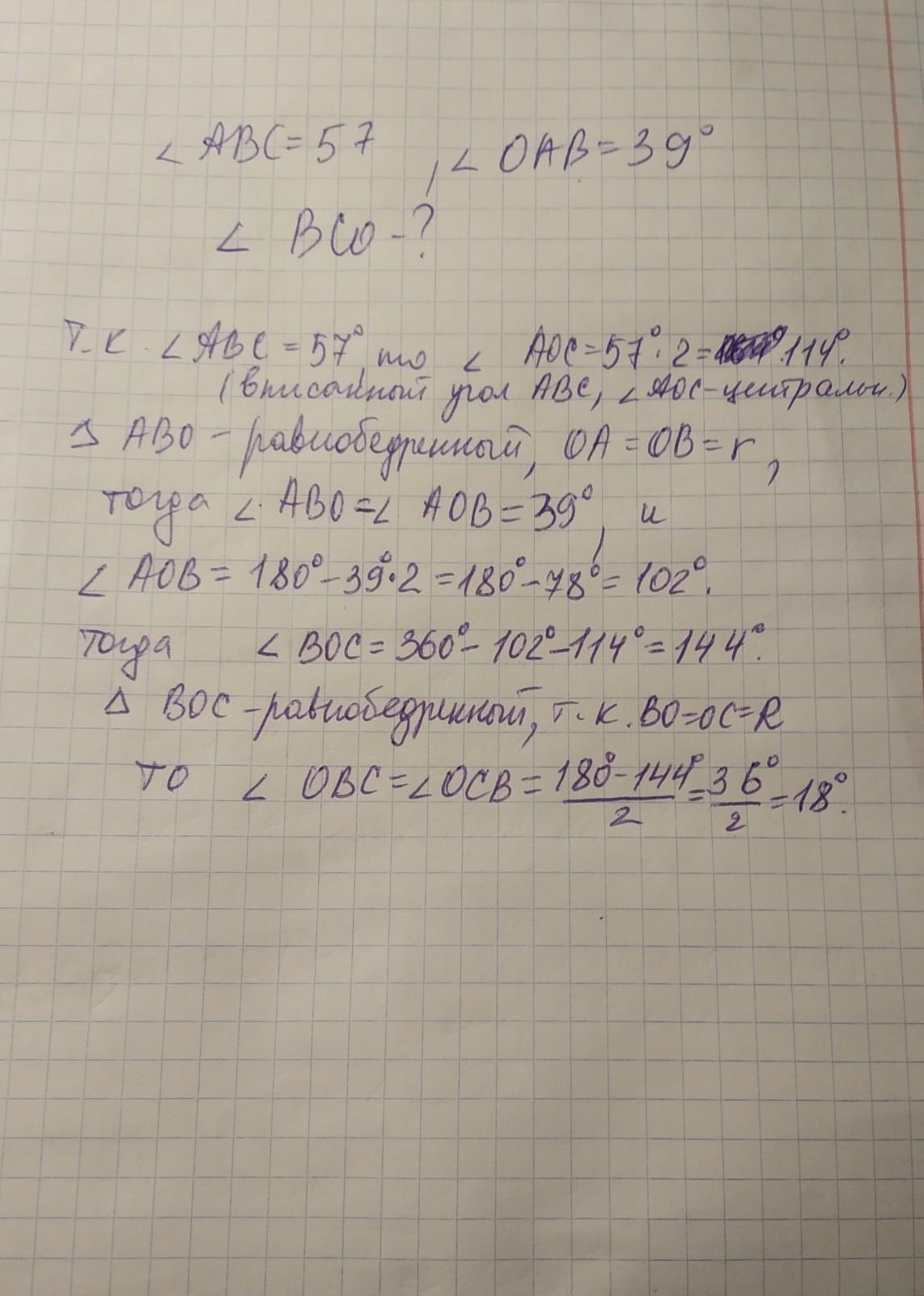 Известно что угол авс 57° и оав 39°