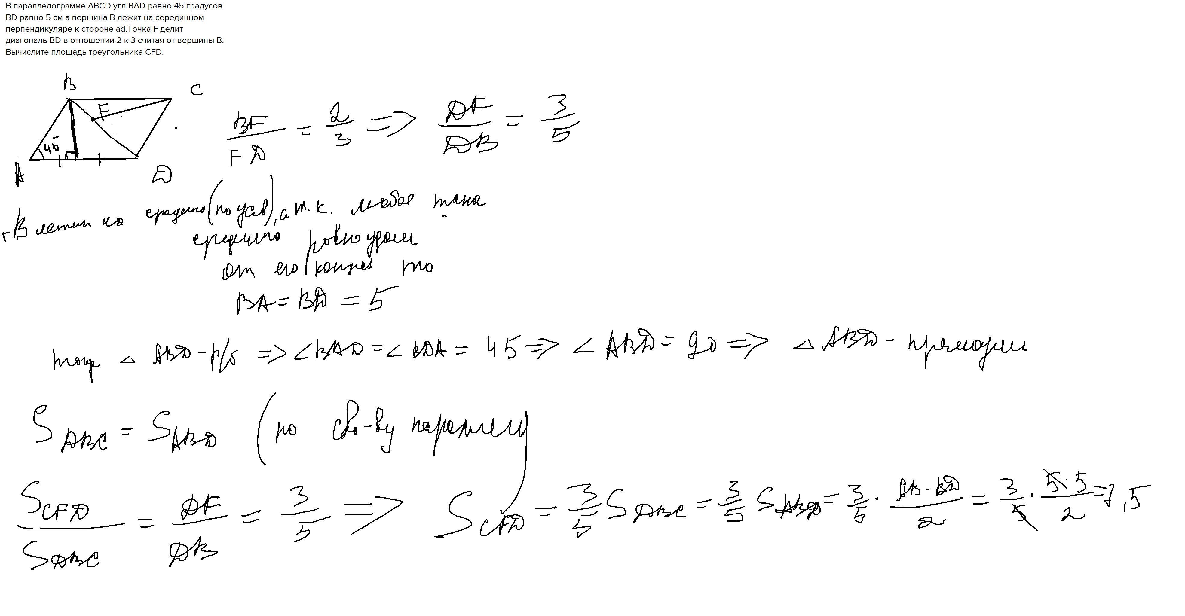в параллелограмме ABCD угл BAD равно 45 градусов BD равно 5 см а вершина B лежит на серединном перпендикуляре к стороне ad.Точка F делит диагональ BD в отношении 2 к 3 считая от вершины B. Вычислите площадь треугольника CFD.