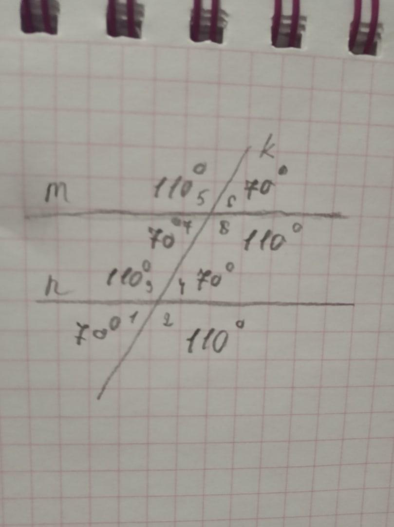 При пересечении двух прямых m и n третьей прямой k образуется восемь углов. Четыре из них равны-70 градусам, другие четыре -110 градусов. Следует ли из этого что прямые m и n параллельны?