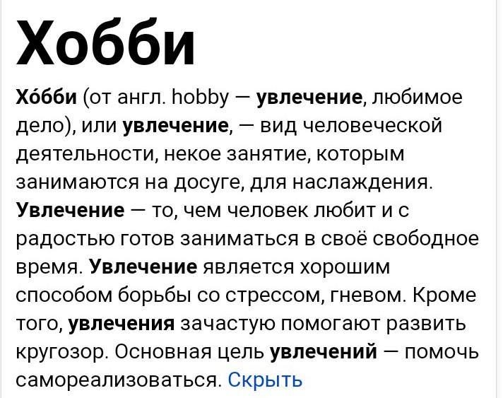 Увлечение или хобби- это то, что ты делаешь с удовольствие коротко говоря твое любимое дело