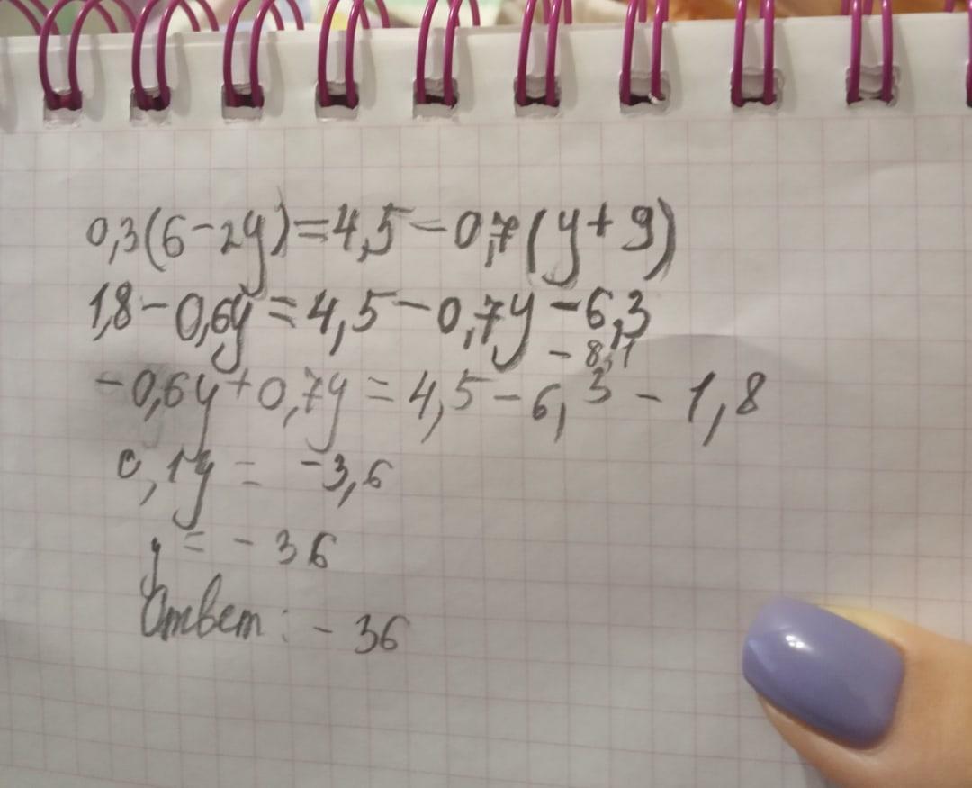 Помогите решить вот это уравнение 0,3(6-2у)=4,5-0,7(у+9) распишите пожалуйста на листочке. Меня учили что сначала 0,3*6 потом 0,3*2. И сначала не известно потом известное. Объясните почему там -36:01 получается -36? Ведь по логике там должно быть 36:(-1) если поможете решить дам 70 баллов или помогу решить вашу задачу