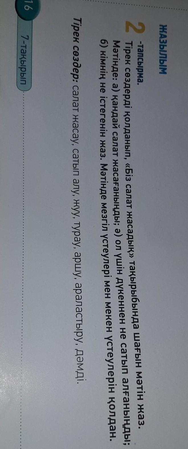Мен бүгін өз қолымнан салат жасағым келді. Ол үшін, дүкенге барып, қажетті заттарды алдым.Яғни: Жұмыртқа, қияр, қызанақ және т.б. Үйге келе сала, салат жасауға кірістім.Анам да маған көмектесті. Кешке қарай,қонақтар келді. Бәрі салаттың керемет шыққанын айтып,мақтады