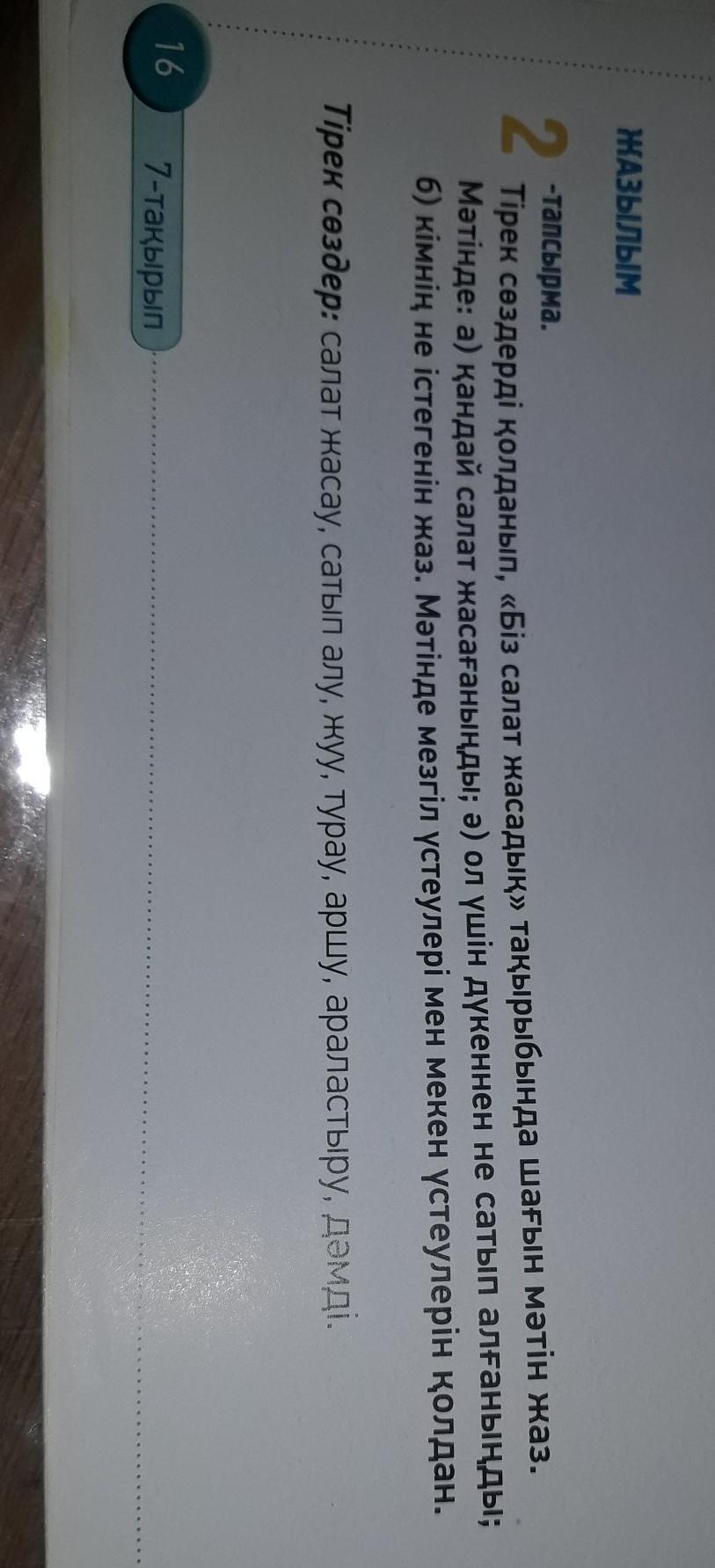 Біз анам екеуміз салат жасадық. Ол үшін керекті көкөністерді дүкеннен сатып алдық. Олар:қияр, қызанақ, салат жапырағы(айсберг).Дүкеннен келген соң, анам маған оларды жуу деп айтты. Мен солай жасадым. Кейін анам оларды турай бастады. Менде көмектестім. Барлығын турап болған соң, оларды араластыра бастадық. Салат дайын болды. Ол өте дәмді шықты.