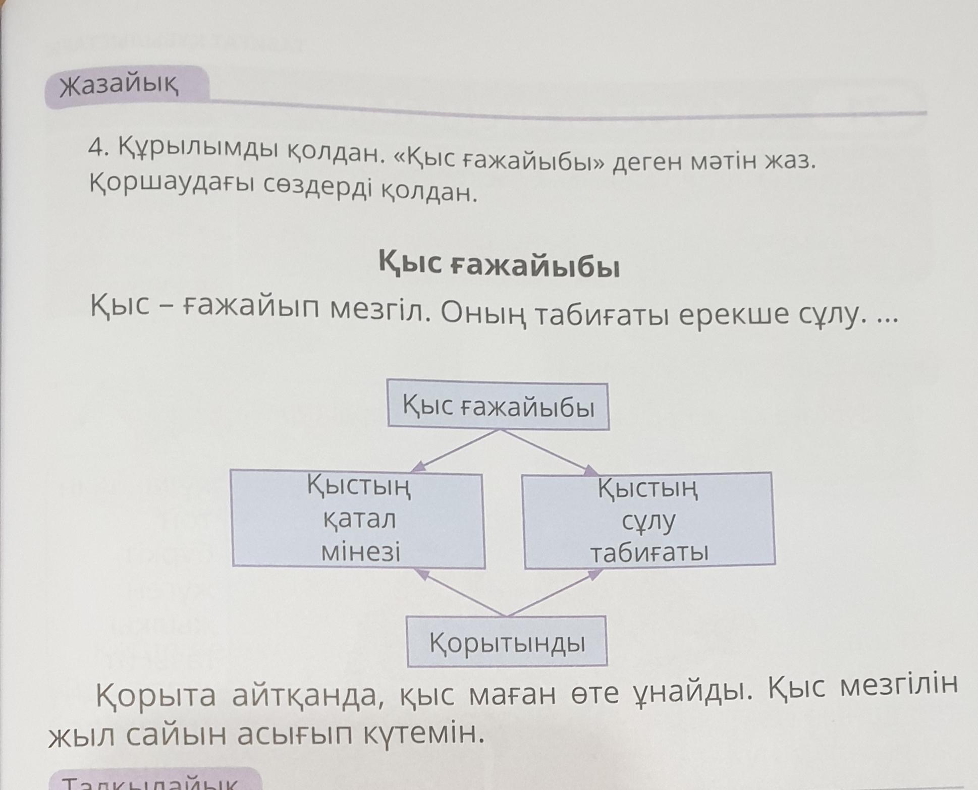 қыс ғажайып.Себебі қыстың қатал үскірік табиғатында біз тоңып мектепке бармаймыз.