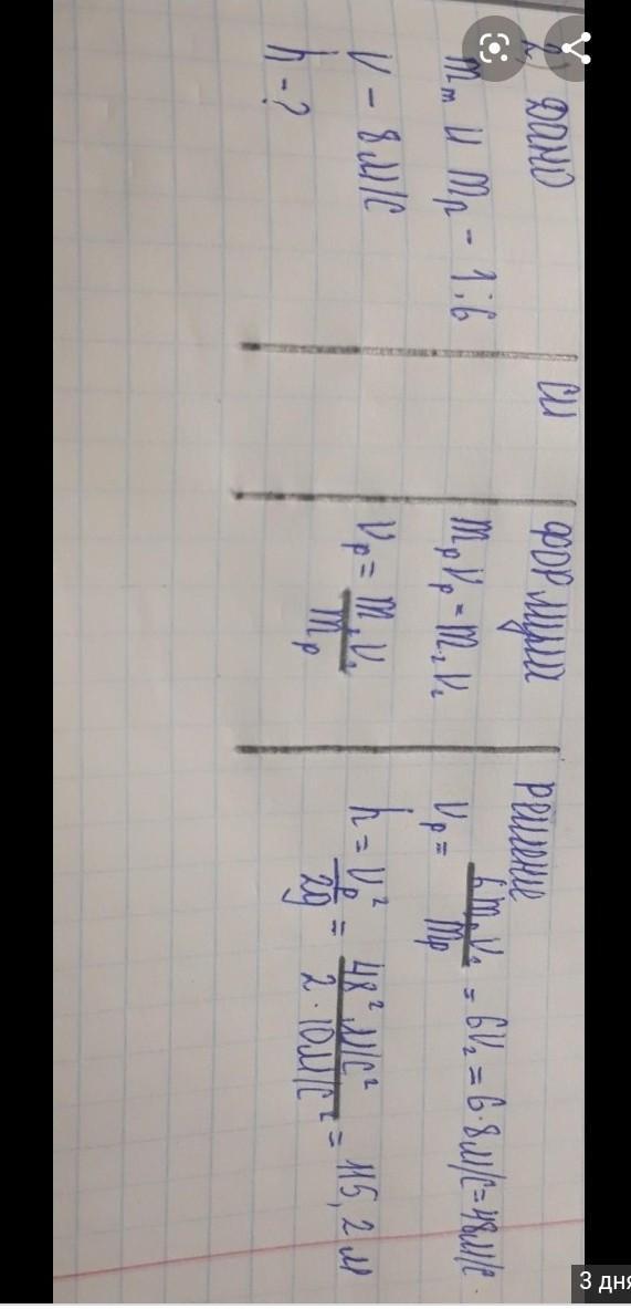 С какой скоростью взлетит модель ракеты, для которой соотношение масс ракеты и топлива равна 1:6? Скорость истечения газов в двигателе достигает 8м/с. На какую высоту поднимется ракета?
