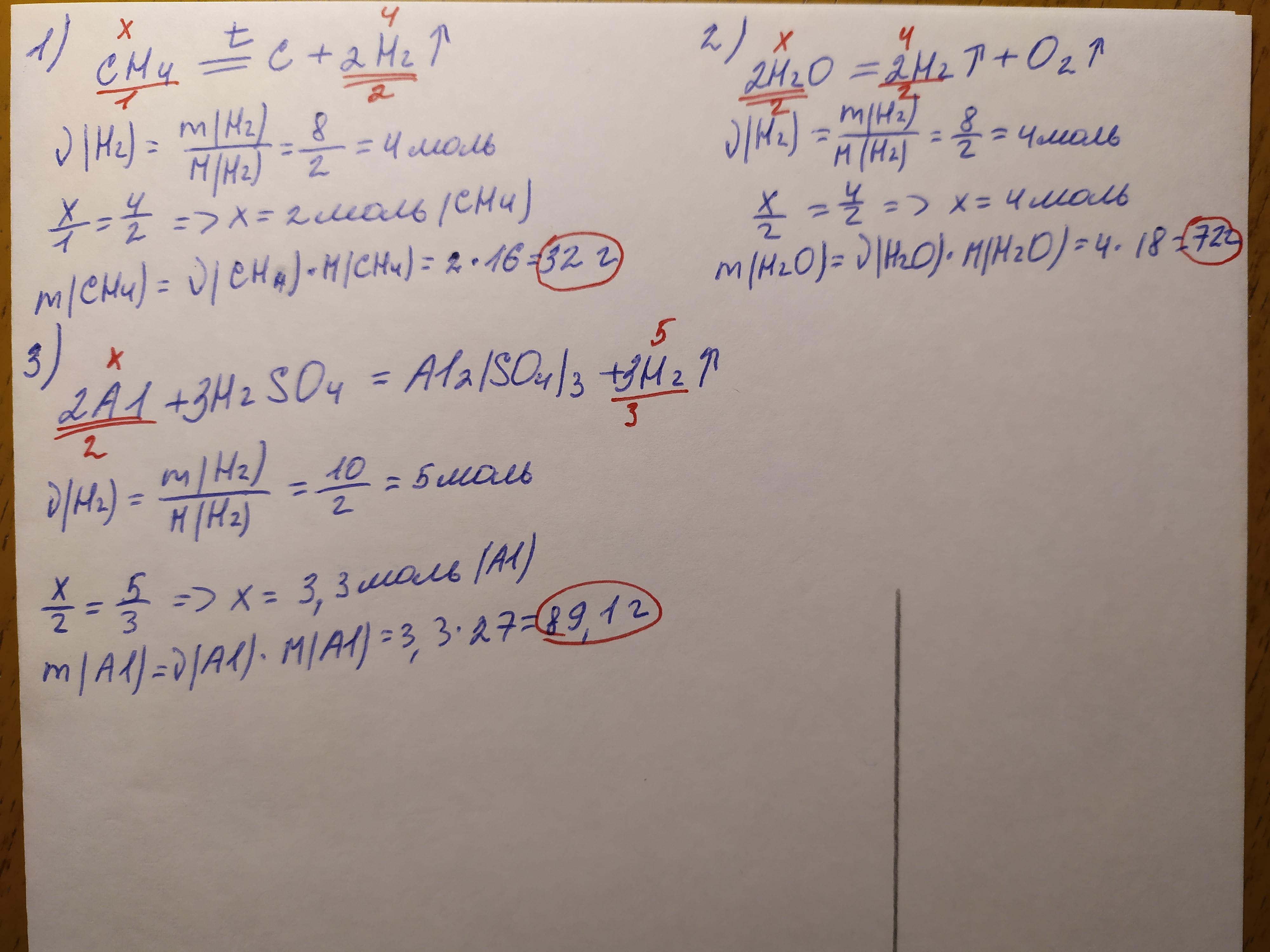 1)Найдите массу метана, необходимую для получения 8г водорода.2) Найдите массу воды, необходимую для получения 8г водорода.3) Какую массу алюминия надо растворить в избытке серной кислоты(Н2SO4),чтобы получить 10г водорода?