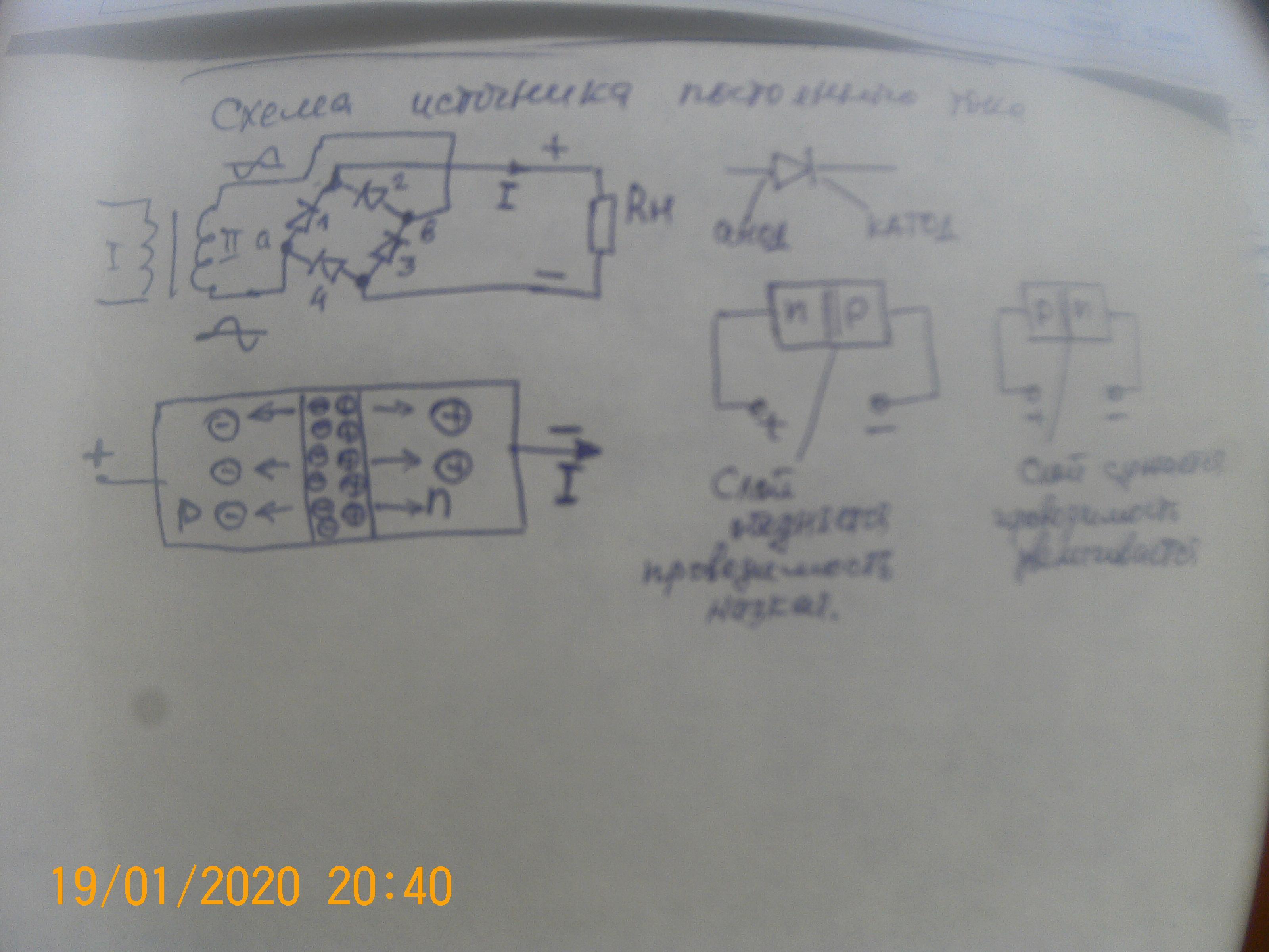 При подаче положительного потенциала на анод и отрицательного на котод одиночного диода, дифузионный слой сузится, проводимость увеличится и электроны побегут к +, а дырки - к (-) рис.слева внизу.