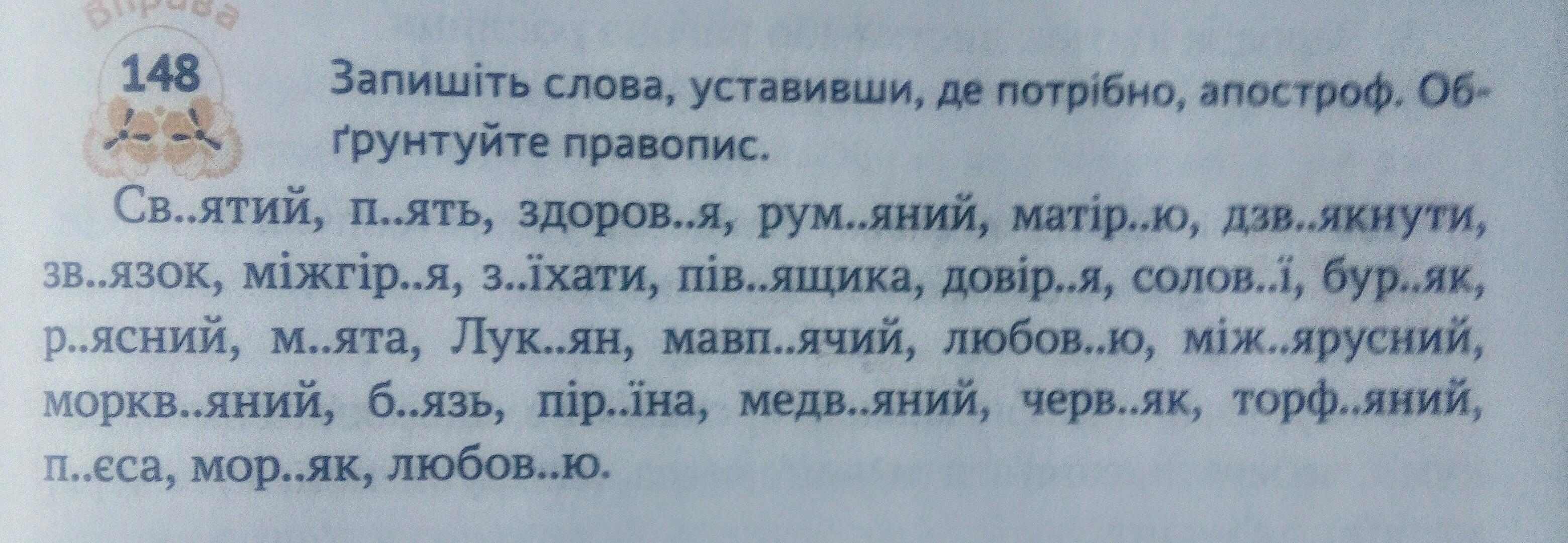 Святий, п'ять, здоров'я, рум'яний, матiр'ю, дзв'якнуьи, зв'язок, мiжгiр'я, з'iхати, пiв'ящика, довiр'я, солов'i, буряк, рясний, м'ята, Лук'ян, мавп' ячий, любовю, мiжярусний, моркв'яний, бязь, пiр'iна, медяний, черв' як, торф'яний, п' еса, моряк, любовю