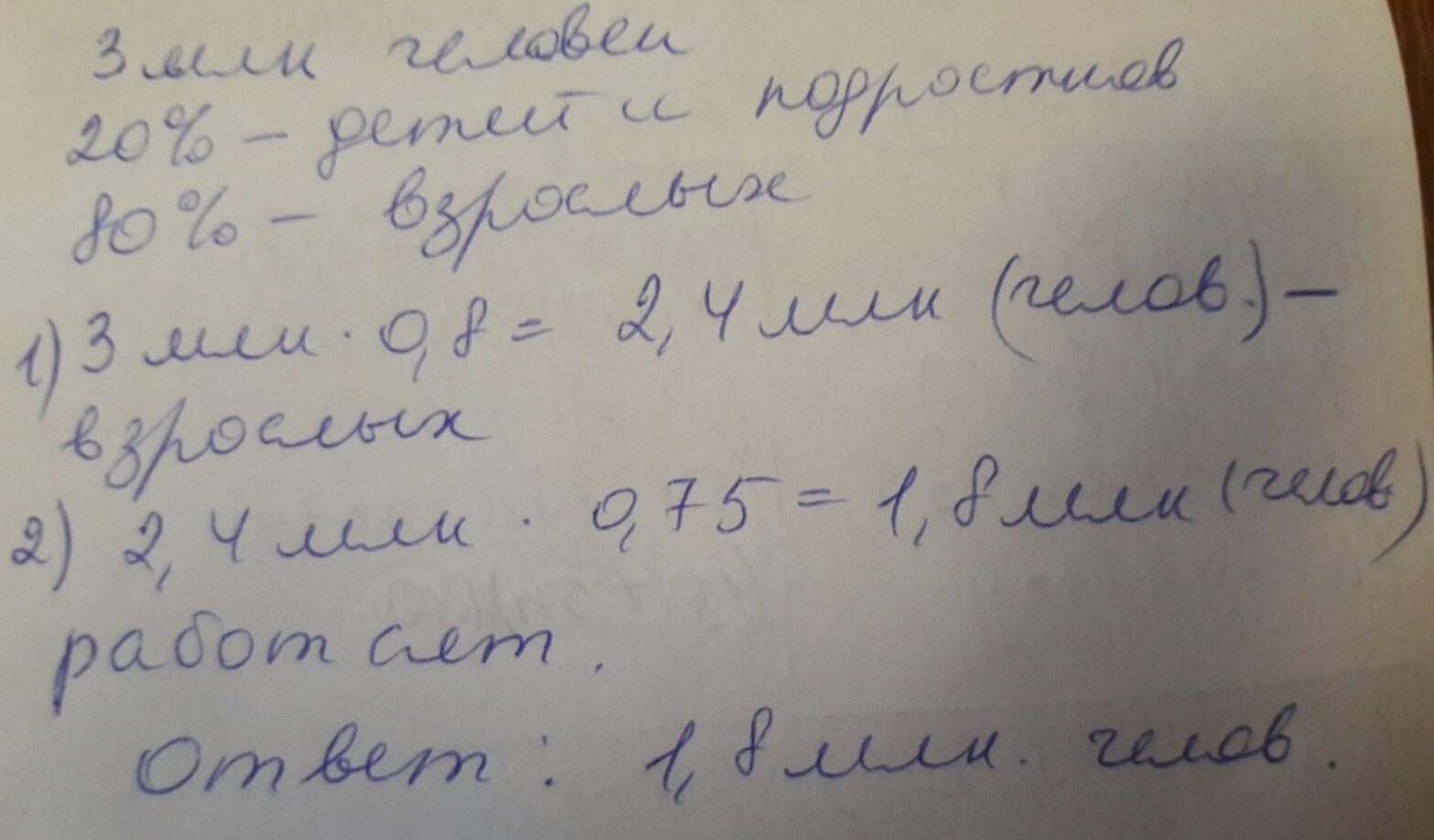 В городе живут 3 миллиона человек. Среди них 20% детей и подростков. Среди взрослых 75% работает. Сколько взрослых жителей работает?