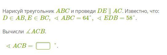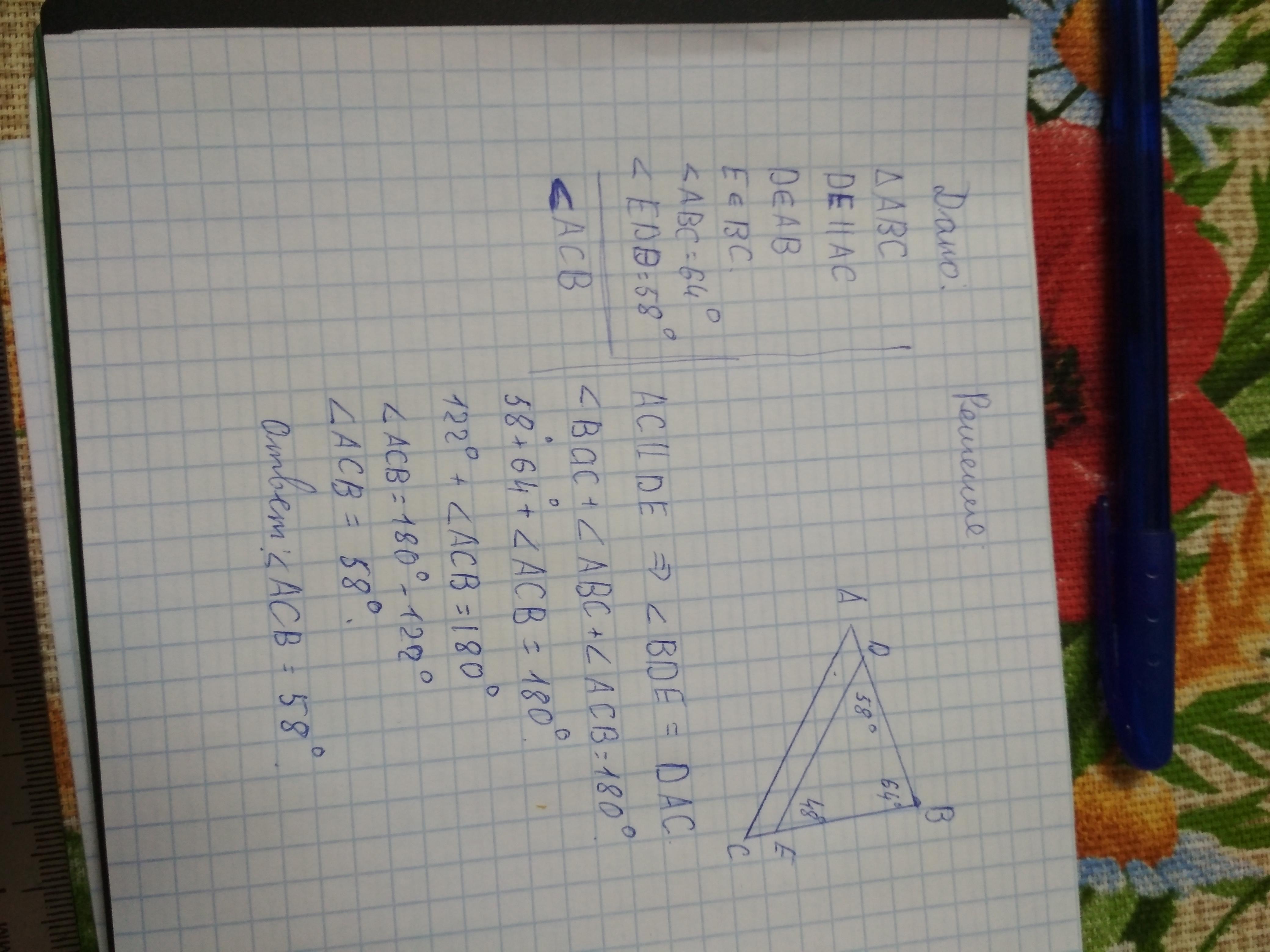 D∈AB,E∈BC, ∢ABC=64°, ∢EDB=58°