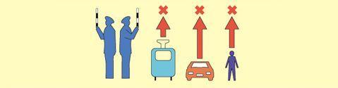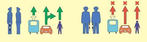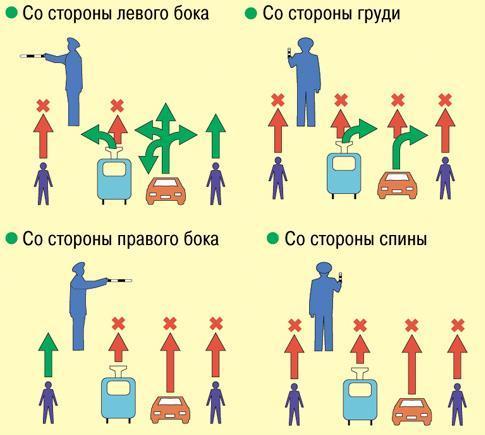 И снова имеет значение положение корпуса. Если Вы видите грудь регулировщика, то можете проезжать направо. Другие направления движения запрещены. Если регулировщик стоит к Вам правым боком или спиной, то движение в любом направлении запрещено. Если регулировщик стоит к Вам левым боком, то Вам повезло — движение разрешено во всех направлениях. Однако это не касается трамваев — им можно только налево. При этом помните, что пешеходы при таком сигнале регулировщика имеют право переходить дорогу за его спиной. Существует несколько общих правил, которые помогут легче запомнить значение сигналов регулировщика. Регулировщик всегда разрешает движение только с двух сторон перекрестка. Вытянутые руки всегда показывают на направления, откуда движение разрешено. Спина регулировщика — это красный сигнал светофора: всегда запрещает движение в любом направлении. Трамваям разрешено движение вдоль рук регулировщика, а машинам еще и разрешается движение правее (исключение — разворот).