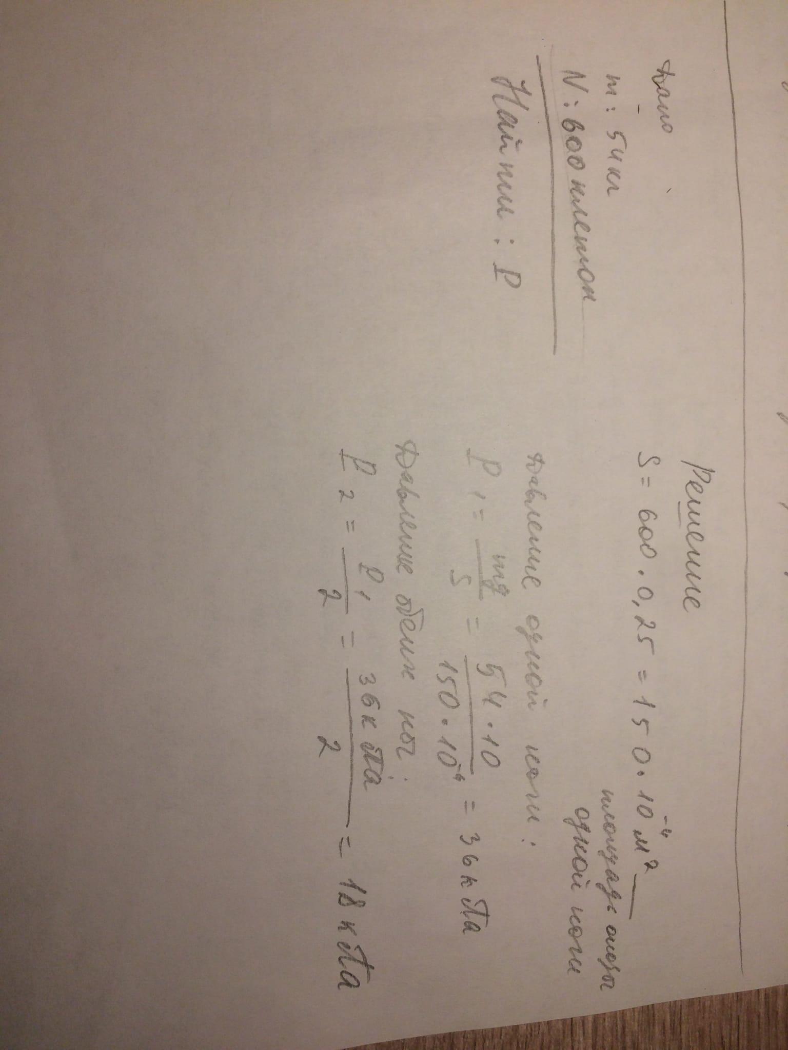 Определив свой вес и площадь подошвы вашей обуви,вычислите , какое давление вы оказываете на пол мой вес 54 клеток получилось 600 размер ноги 41
