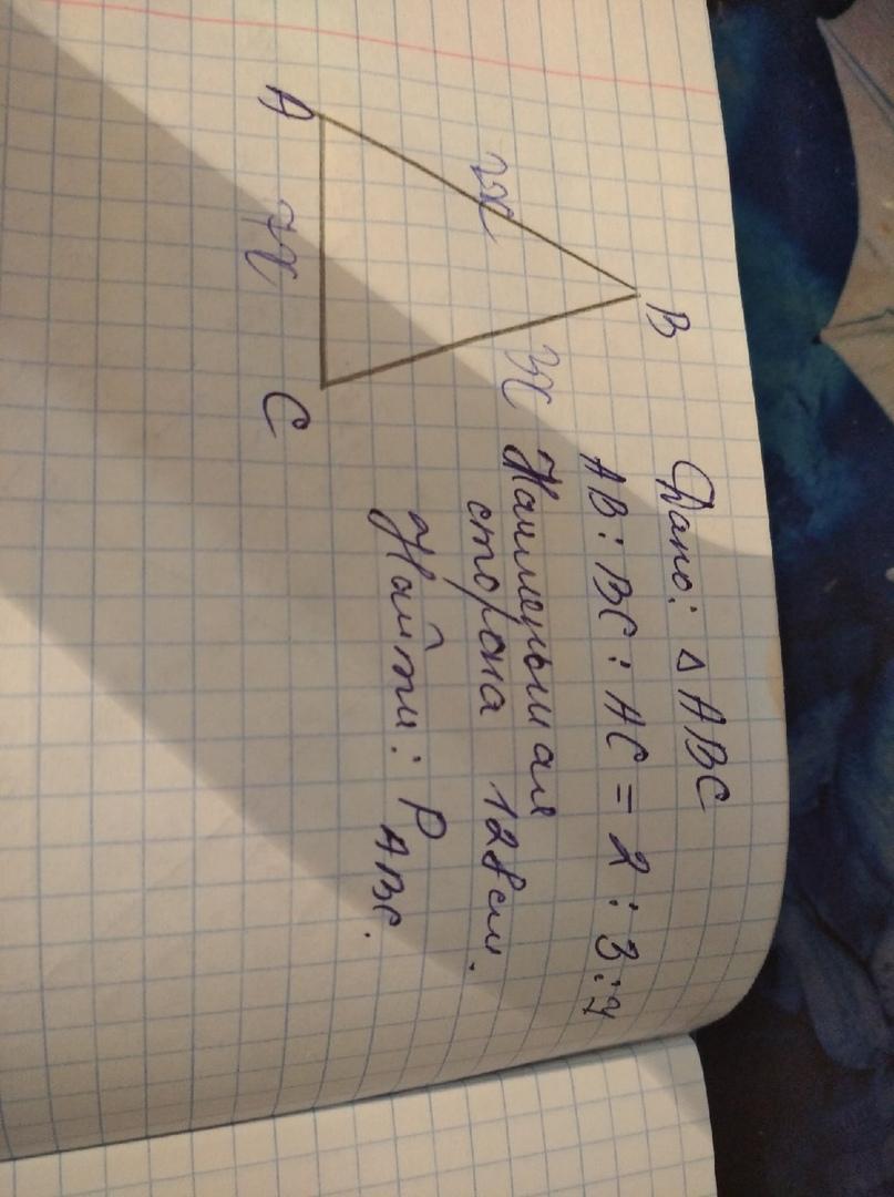 Все на фотографии(надеюсь понятно) Треугольник abc ab=bc=ac =2=3=7 Наименьшая сторона 128 см найти периметр abc