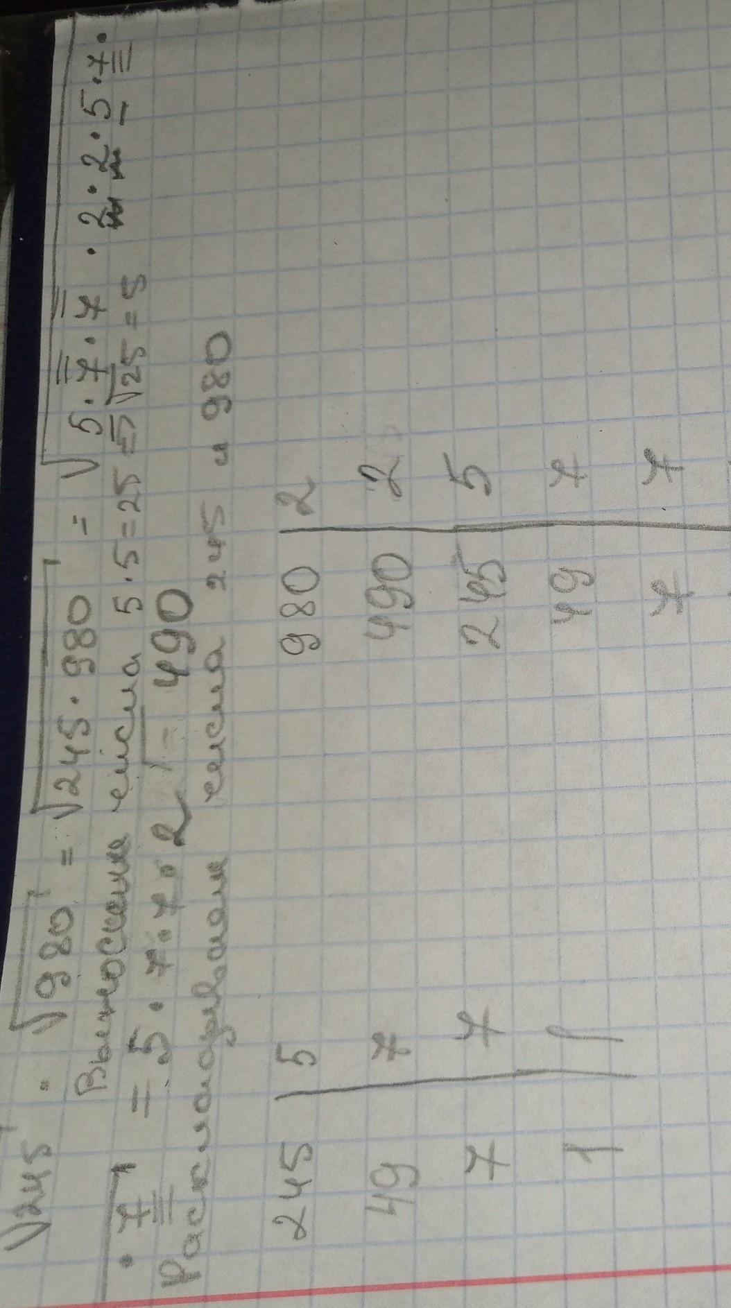 Найдите значение выражения : Корень 245 умножаем корень 980. Сам ответ не нужен, так как знаю что будет 490, мне нужен пример, как такие корни решать типо, решите это грамотно и понятно, чтоб я все понял, пожалуйста, буду очень благодарен)