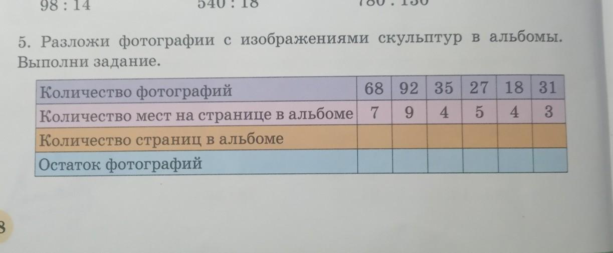 Если на странице можно поместить некое количество фотографий, то считаем количество полных страниц и записываем в оранжевую строчку. Для этого делим количестао фото на количество мест. В скобках написан остаток, который нужно записать в голубую строчку.