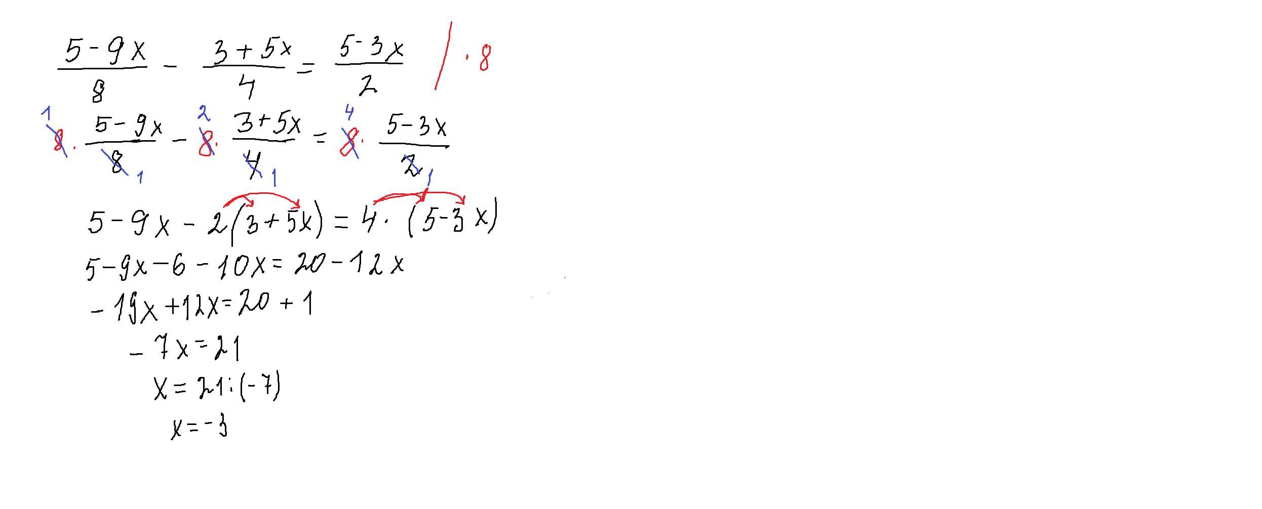 наидем общий знаменатель для чисел 8 ;2 и 4,это число 8.Умножим каждую дробь на 8 и избавимся от знаменателя.потом решаем линейное уравнение