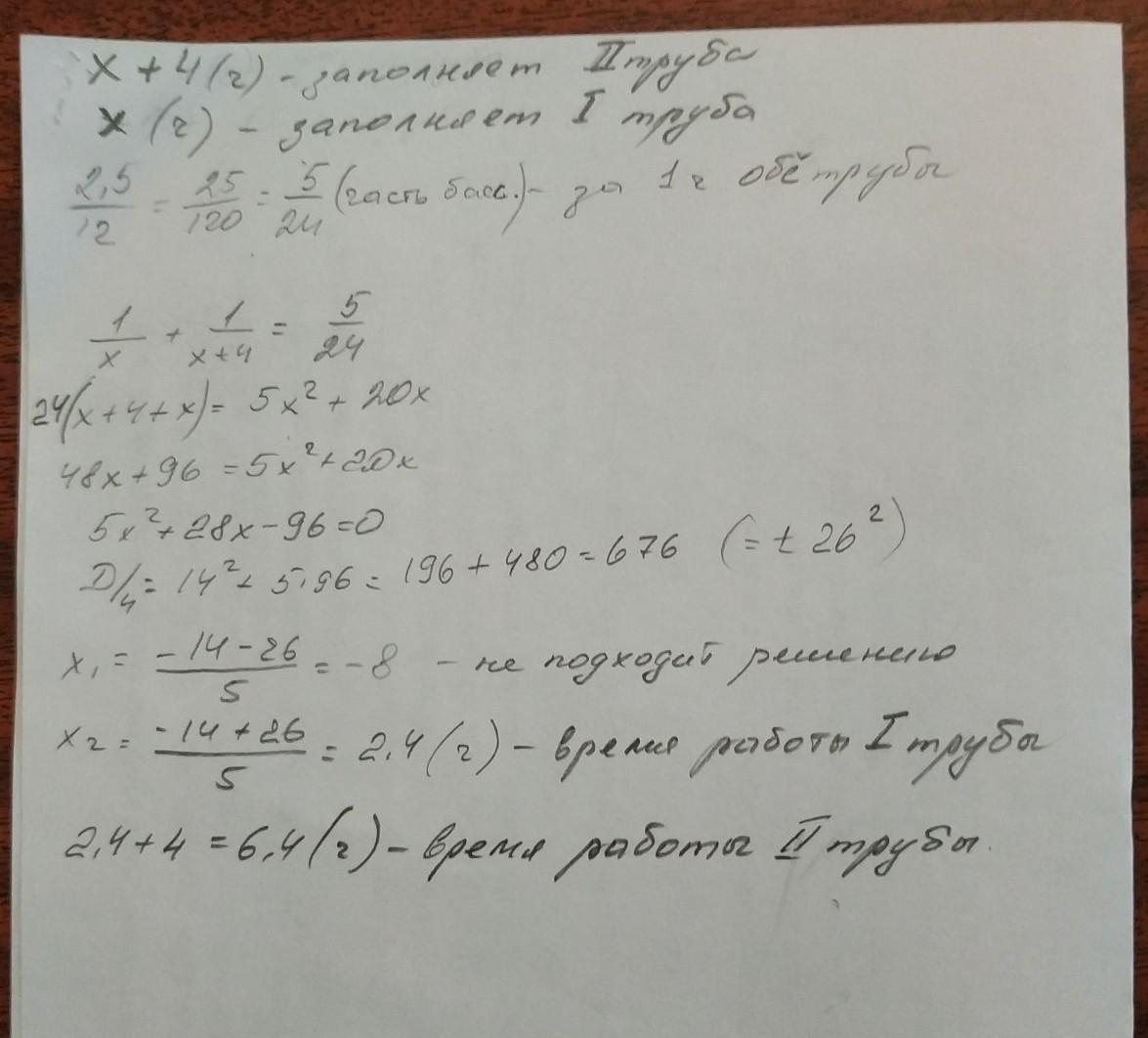 Первая труба наполняет бассейн на 4 ч быстрее, чем вторая. За какое время наполнит бассейн вторая труба, если за 12 ч совместной работы две трубы наполнят 2,5 таких бассейна?