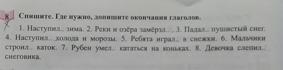 1. Наступила; 2. Замёрзли; 3. Падал; 4. Наступили; 5. Играли; 6. Строили; 7. Умели; 8. Слепила.