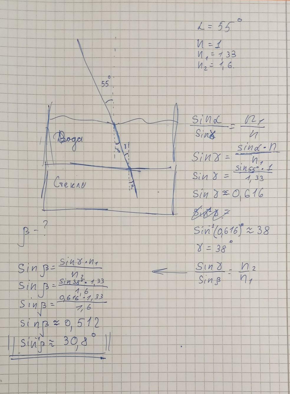 Луч света переходит из воды (n=1,33 )в стекло (n=1,6 )Угол падения равен 55 градусов.Найдите угол отклонения луча от первоначального.Сделайте чертеж