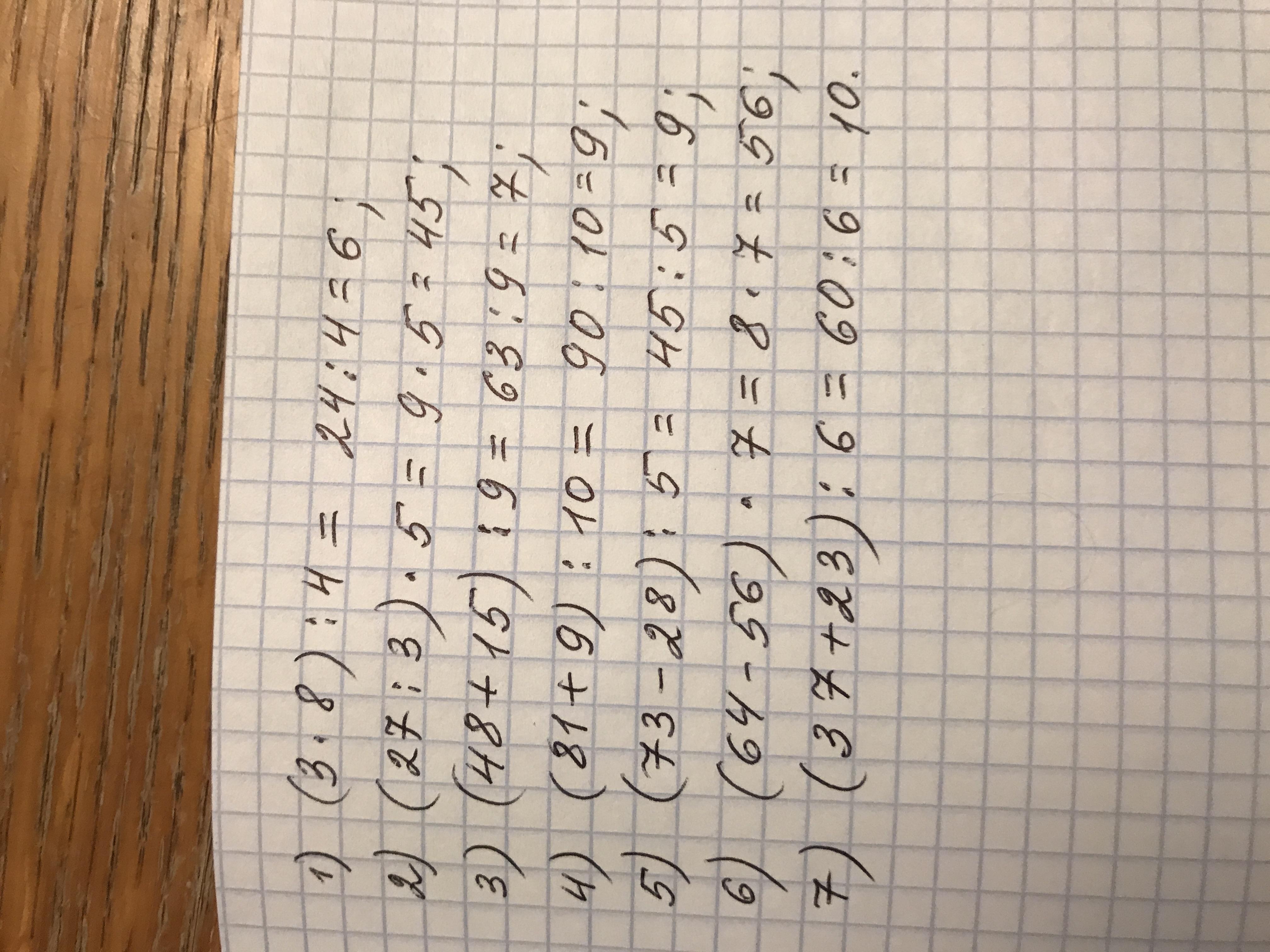1) Произведение чисел 3 и 8 уменьши в 4 раза.2)Частное чисел 27 и 3 увеличь в 5 раз.3) Сумма чисел 48 и 15 уменьши в 9 раз .4) Сумму чисел 81 и 9 уменьши в 10 раз.5) Разность чисел 73 и 28 уменьши а 5 раз.6) Разность чисел 64 и 56 увеличь в 7 раз. 7)Сумму чисел 37 и 23 уменьши в 6 раз.