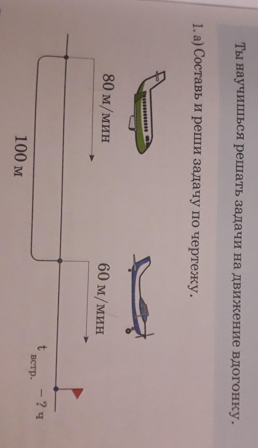 Пилот самолёта Сочи-Москва, двигающегося со скоростью 80 м/мин, на подлёте к Москве увидел перед собой легкомоторный самолёт, движущийся в том же направлении со скоростью 60 м/мин. Через какое время самолёты поравняются, если расстояние между ними 100 м?