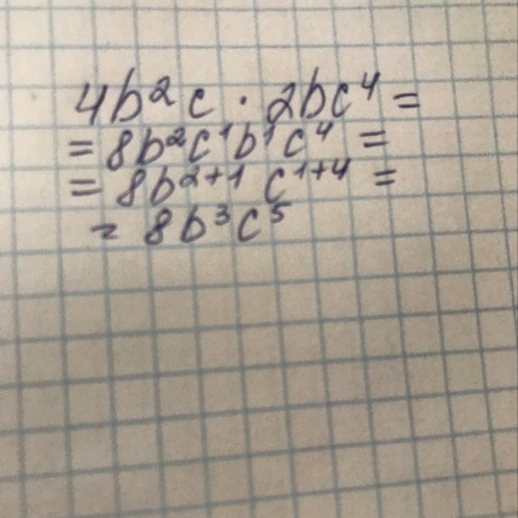 4b²c * 2bc⁴ = 4 * 2 * b²⁺¹ * c¹⁺⁴ = 8b³c⁵