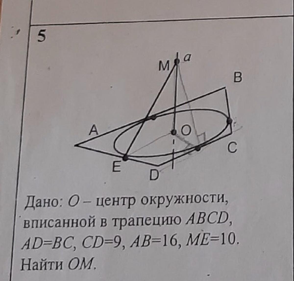 Если окружность вписана в трапецию, значит для нахождения её радиуса используем формулу: r=√(АВ*DC)/2=√(16*9)/2=6, тогда по т. Пифагора МО=√(МЕ²-r²)=√(100-36)=8.